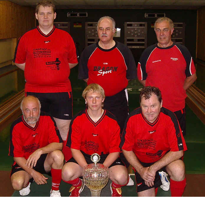 Das Finale der Bezirksmannschaften bestritten Links Vorbei Bad Rodach und der Pokalverteidiger Fortuna Wiesenfeld, der auch besser aus den Startlöchern kam. Fabian Engmann (403) musste sich Marcel Bajus (408) zwar knapp geschlagen geben, aber Werner Beiersdorfer (427) brachte Wiesenfeld gegen Moritz Schmidtlein (383) mit 39 Holz in Führung. Im Mittelpaar schafften aber die Rodacher die Wende, denn Udo Klett (443) und Norbert Kindler (427) distanzierten Thomas Höhn (368) und Helmut Engmann (412) deutlich. Die 51 Holz Vorsprung brachten dann schließlich Julian Bajus, mit dem Bestergebnis von 449 und Franz Meinunger (418) gegen Thomas Bär (429) und Klaus Fleischmann (421) zum 2528:2460-Sieg sicher ins Ziel. |